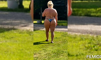 My wife answer delivery folks wearing micro biquini. She shows her puffies at the balcony for their.