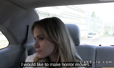 Czech blonde bangs on hood of fake taxi in woods