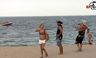 जर्मन किशोर त्रिगुट और महिला महिला पुरूष के लिए समुद्र तट पर उठाया