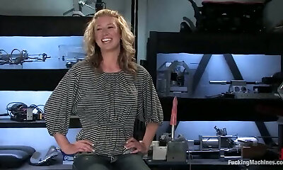 स्लिम सुनहरे बालों वाली लड़की खुद को एक मशीन पर गर्म अनुभव कर रही है