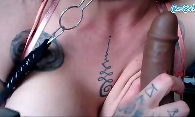 सोलो टैटू रेड इंडियन टेलर निकोल 4 एल में ग्लास डिल्डो के साथ खेल रहा है ।