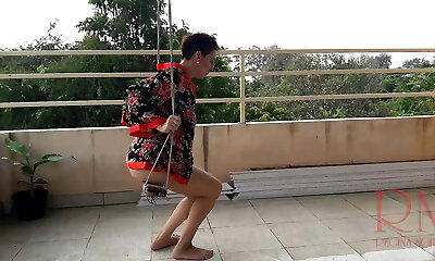 Cute housewife has fun without panties on the swing Slut swings and shows her flawless pussy 1