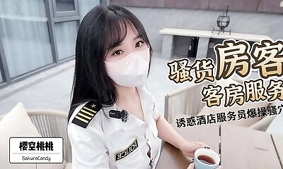 The mega-slut housekeeper in room service!tempts the hotel waiter to have her pussy fucked and creampied without a condom!