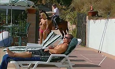 Rough outdoor dicking by the pool completes with Suttin getting a cum shot