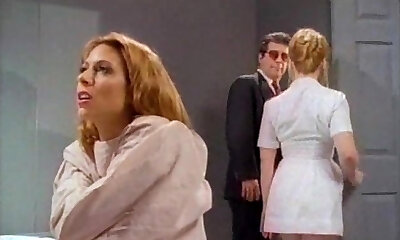 Chesty Krankenschwester bietet ihre Melonen dem Arzt an