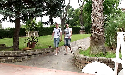 Slutty brunette housewife in torn jeans gets poked by 2 fellows tough